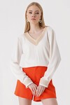 Merterium 0466 Nakışlı V Yaka Örme Bluz - Siyah